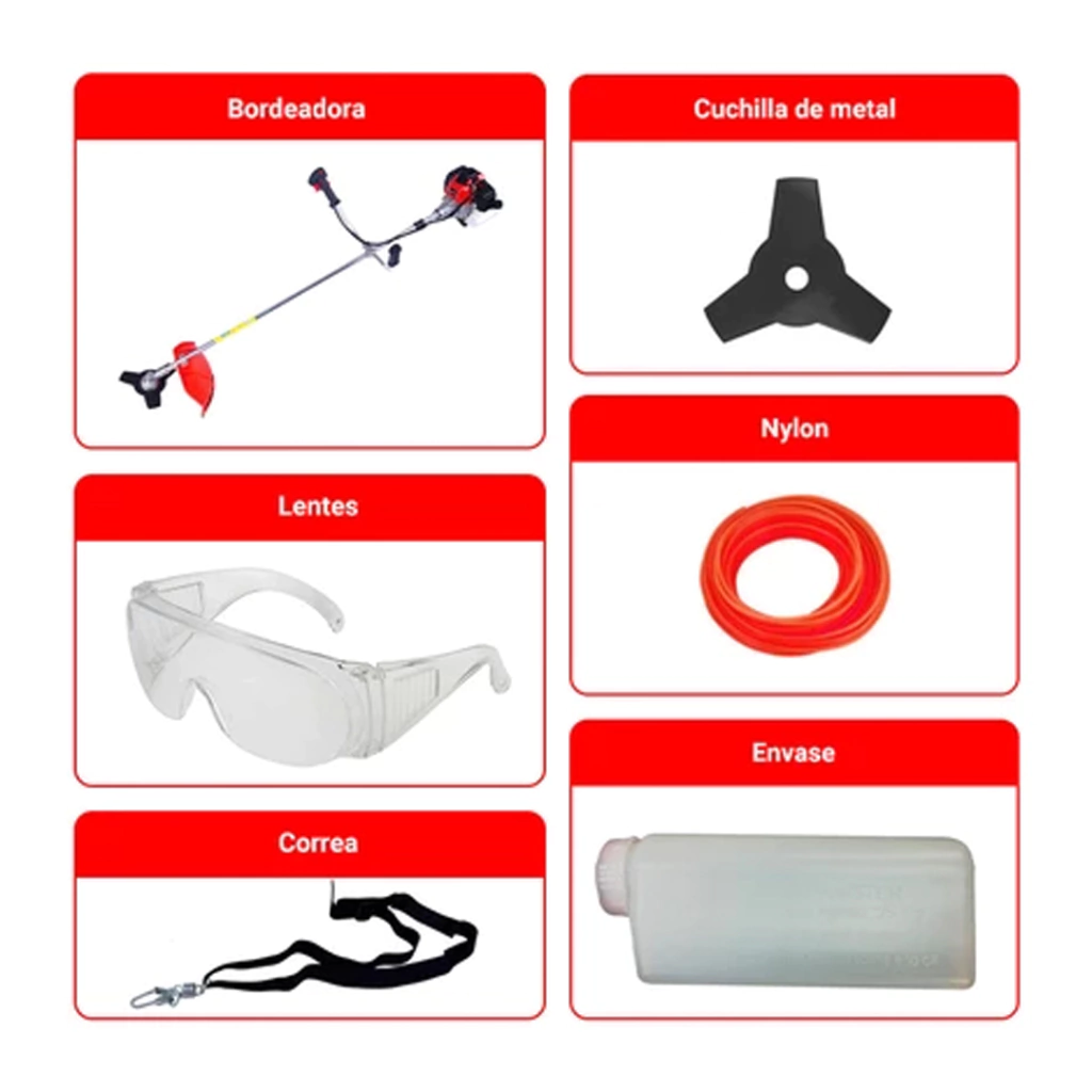 · Incluye accesorios: Cuchilla metálica, cuchilla de nylon, lentes de protección, cable, correa.