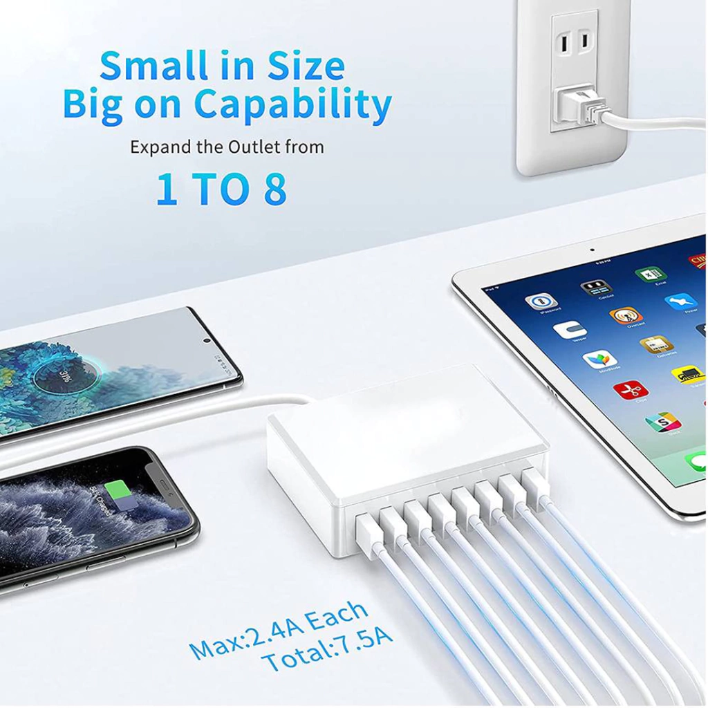 8 puertos USB, cargo de soporte con 8 dispositivos simultáneamente, woks con cualquier dispositivo de energía USB.